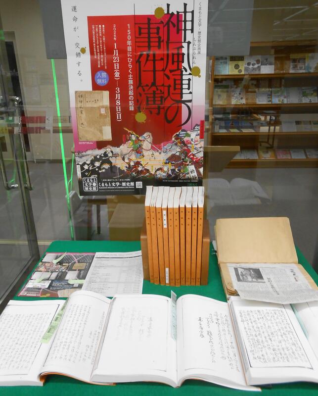 くまもと文学・歴史館で開催中の企画展「神風連の事件簿―150年目にひらく士族決起の記録―」にあわせて、関連する本や雑誌、新聞記事を展示しています。