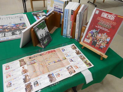 震災当時の全国各地の新聞原紙(製本版)も展示しています。各新聞社が熊本地震をどのように報道したのか、