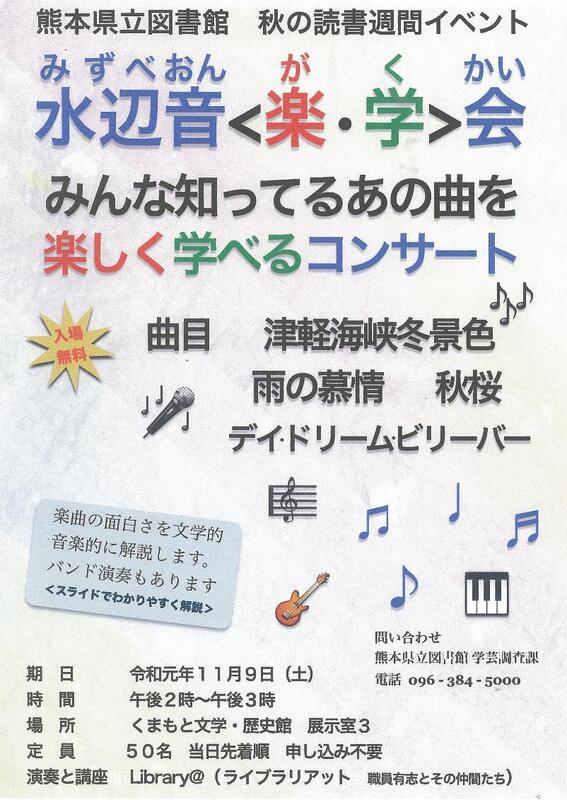 秋の読書週間のイベントとして、水辺音<音・学>会(みずべおんがくかい)を開催します。