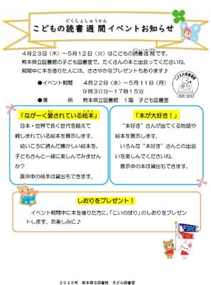 くわしくは、 チラシを クリック、 または こちらのリンク:R8(2026)こどもの読書週間イベントから チラシのPDFファイルを 見ることが できます。